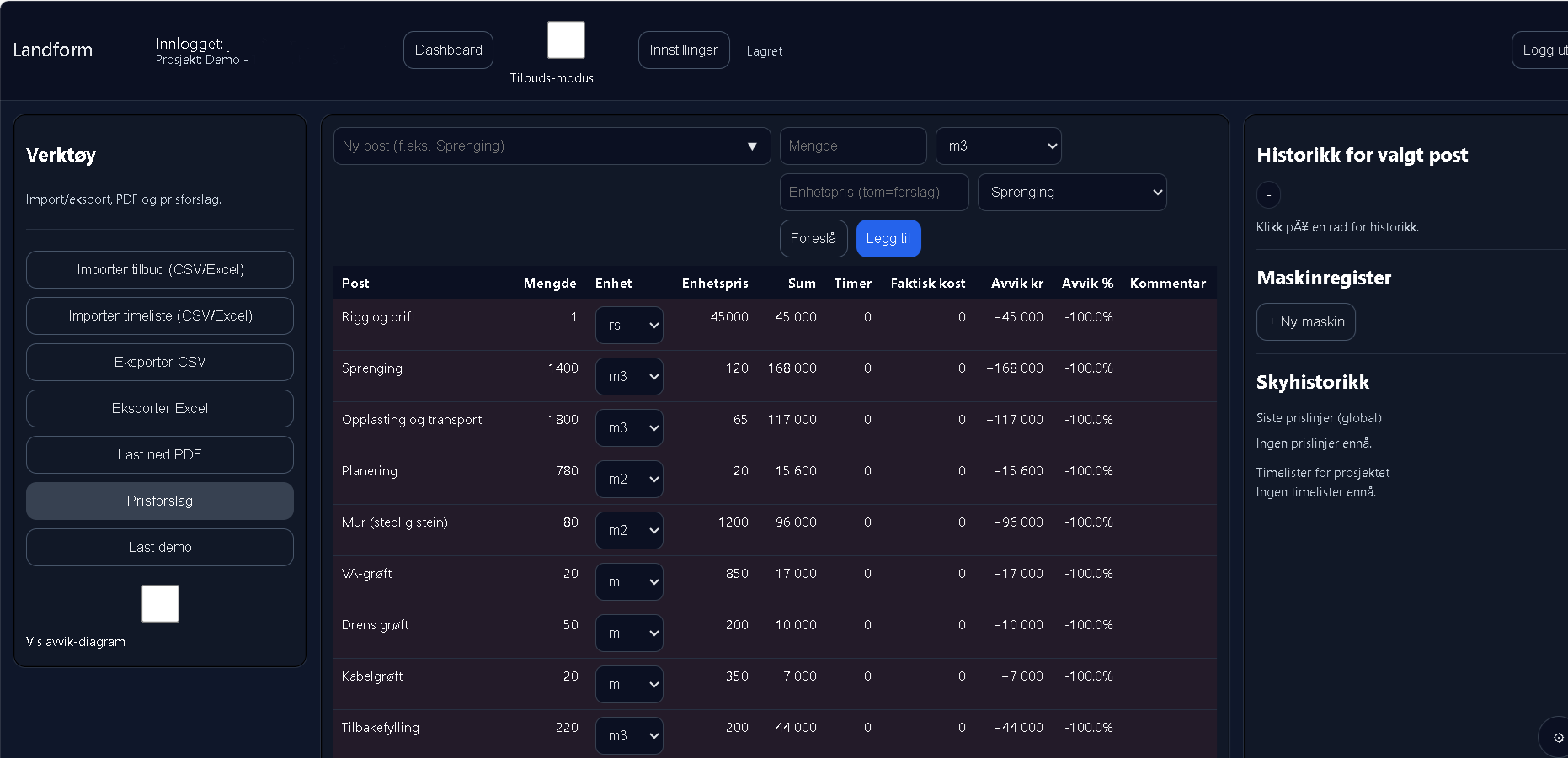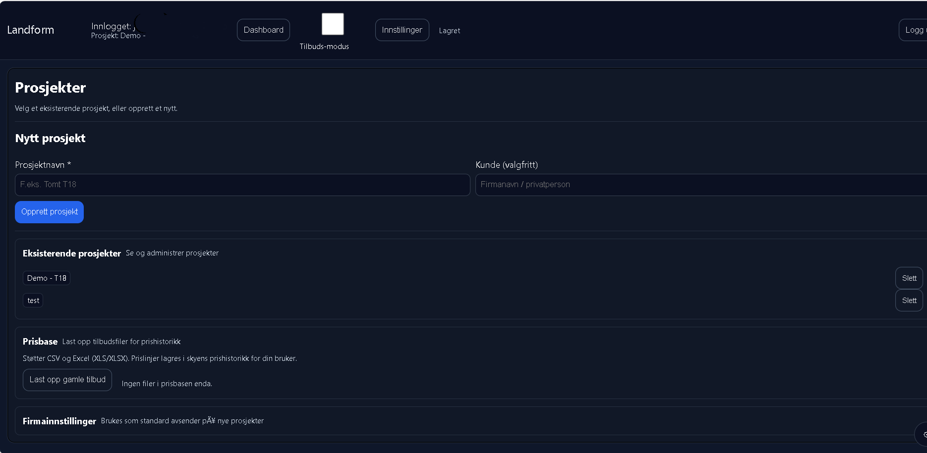Landform Kalkyle er laget for entreprenører og byggefirmaer som trenger et enkelt, men effektivt verktøy for å beregne kostnader og holde oversikt over tidligere prosjekter. Med Kalkyle kan du enkelt lage prisoverslag, sammenligne tomter og byggeprosjekter, samt følge med på prisutviklingen over tid.